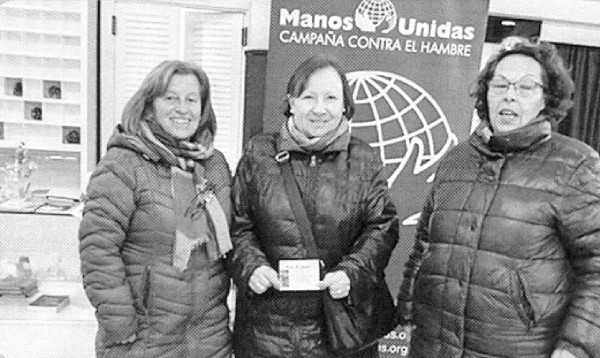 Entrega del primer premio de la cesta de Navidad 2025 de Manos Unidas a José Luis Montiel por parte de la ONG. La coordinadora local Mª Teresa Iniesta y la voluntaria Pili Agenjo.